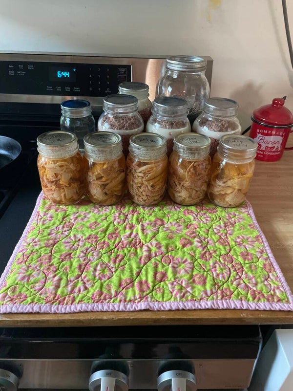 Handmade quilted canning mat — “Blue Stars” patriotic fabric with coordinating binding, sized 18×22 inches. Doreen’s Quilting Creations, Muskegon MI.