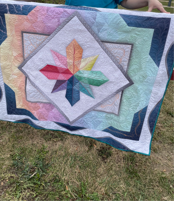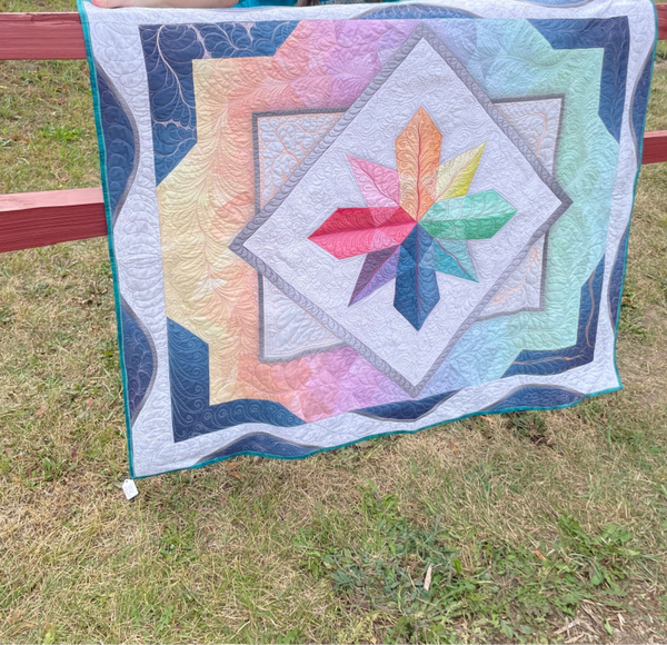 This quilt measures approx 50x60 and was a panel from Angela Walters class learning to do feathers.